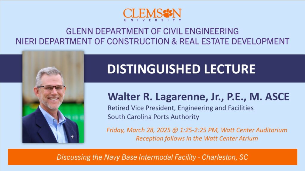 Mr. Walter R. Lagarenne, Jr. will deliver a distinguished lecture on Friday, March 28, 2025 at Clemson University, sponsored by the Glenn Department of Civil Engineering and the Nieri Department of Construction and Real Estate Development. His seminar discusses Charleston’s “Navy Base Intermodal Facility – South Carolina Ports Authority.” This seminar will be held at the Watt Family Innovation Center auditorium at 1:25 p.m. with a reception following in the Watt Center atrium. Please join us in welcoming Mr. Lagarenne back home to Clemson!