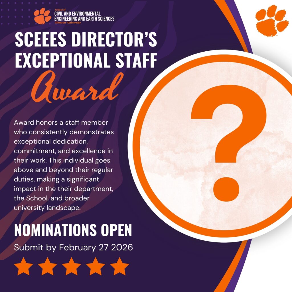 The School of Civil and Environmental Engineering and Earth Sciences (SCEEES) is pleased to open nominations for the second annual Director’s Exceptional Staff Award.