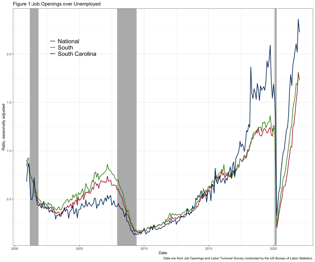 Figure 1 uses data from JOLTS to plot the number of job openings divided by the number of unemployed workers, labor market tightness for South Carolina, states in the South region, and nationally. In the graph, a value of 1.0 means that there is a job opening for each unemployed worker, and the dates of recessions are shaded in grey. Labor market tightness is cyclical, rising during economic expansions and falling during recessions. Before the financial crisis in 2008, South Carolina had fewer job openings per unemployed worker than both the national average and the southern states. After the financial crisis, all three regions had similarly low labor market tightness and recovered until 2017. Between 2017 and the pandemic in March 2020, labor market tightness in South Carolina reached levels above 1.5, higher than the South and National averages, which were around 1.25. While labor tightness again crashed during the pandemic, it has returned rapidly, with South Carolina again outpacing both the national average and the south.