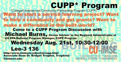 The College/Underserved Community Partnership Program (CUPP) is a federal program that connects the intellectual strengths of College faculty, staff, and students with small or underserved communities. Project ideas are generated by community leaders, and CUPP personnel from branches of the federal government help to connect the projects to University people who may want to address the identified needs. Clemson campus engages in high-impact practices – research, service-learning, project-based curricula – with our graduate and undergraduate students. Faculty and professional staff and students are welcome to think creatively about how the community needs may fit with our educational priorities. Many projects are highly applicable for cross-College collaboration. If you are interested in learning more about any of these project ideas and to get started with community leaders, please contact Associate Dean Dr. Bridget Trogden, Trogden@Clemson.edu.
