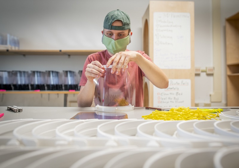 Arthur Southern, a 2020 Clemson graduate with a master’s in architecture from Gaston, S.C., assembles face shields produced with 3D printers by a group of architecture graduate students and recent graduates to help Clemson first responders during the caronavirus crisis, May 15, 2020. (Photo by Ken Scar)