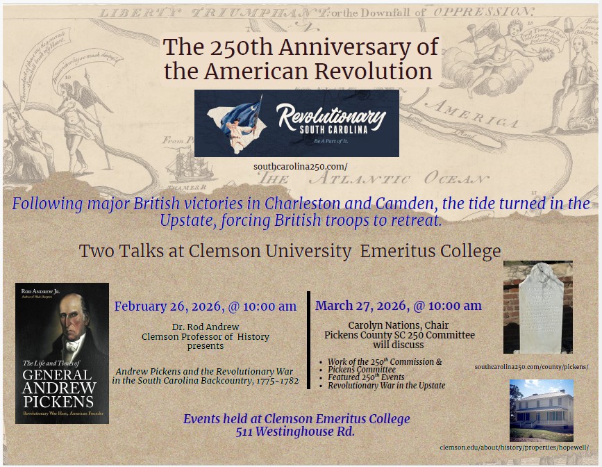 ~On February 26, at 10:00 am, Dr. Rod Andrew, Clemson Professor of History, will present “Andrew Pickens and the Revolutionary War in the South Carolina Backcountry, 1775-1782.”