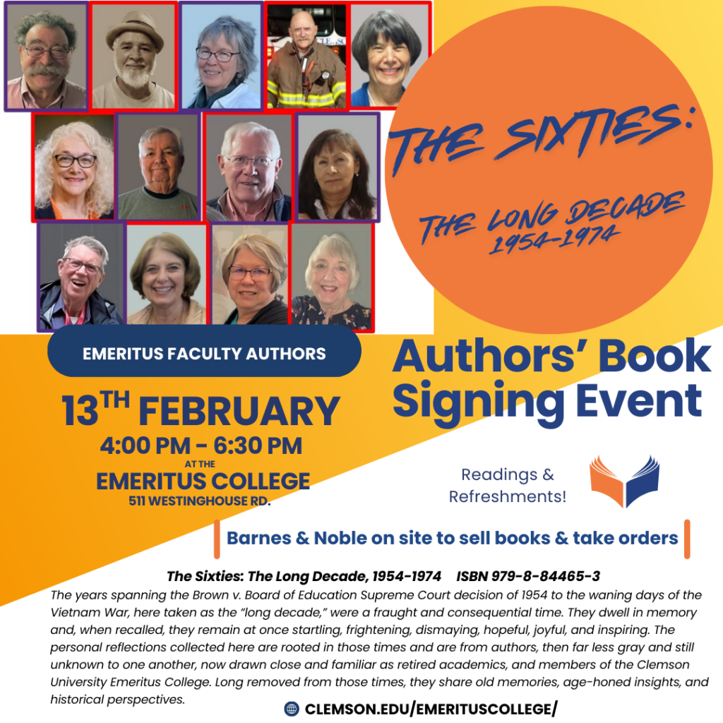 Hybrid: Zoom and In Person at the Emeritus College. Please email emerituscollege@clemson.edu for the Zoom link or attend in person at the Emeritus College in Clemson’s Regulatory Building at 511 Westinghouse Rd.