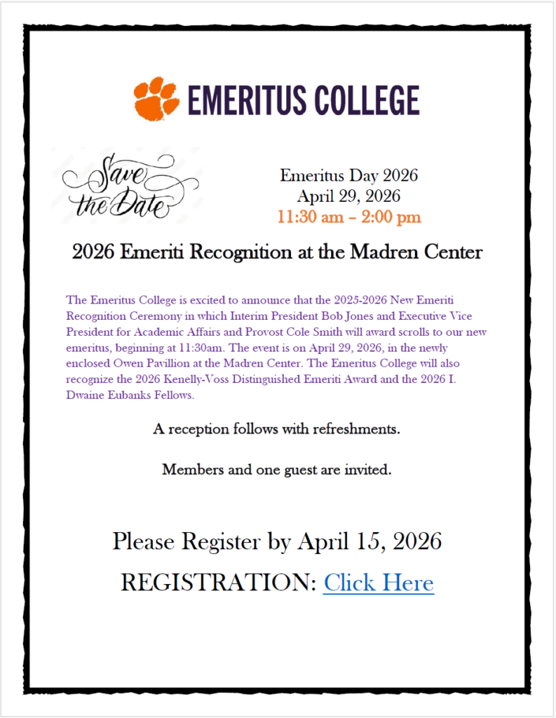 The Emeritus College will award the Kenelly-Voss Distinguished Emeriti Award and the I. Dwaine Eubanks Emeritus College Fellows at Emeritus Day on April 29, 2026. Below, please find the award descriptions and a link to each award nomination form. These links take you to our website, and the nomination form is on the same webpage as the award description. Please fill out the online form (type in your recommendation or if you prefer, upload your recommendation letter in a document): we no longer require email submissions. Please contact Victoria at vmushef@clemson.edu if you need help.