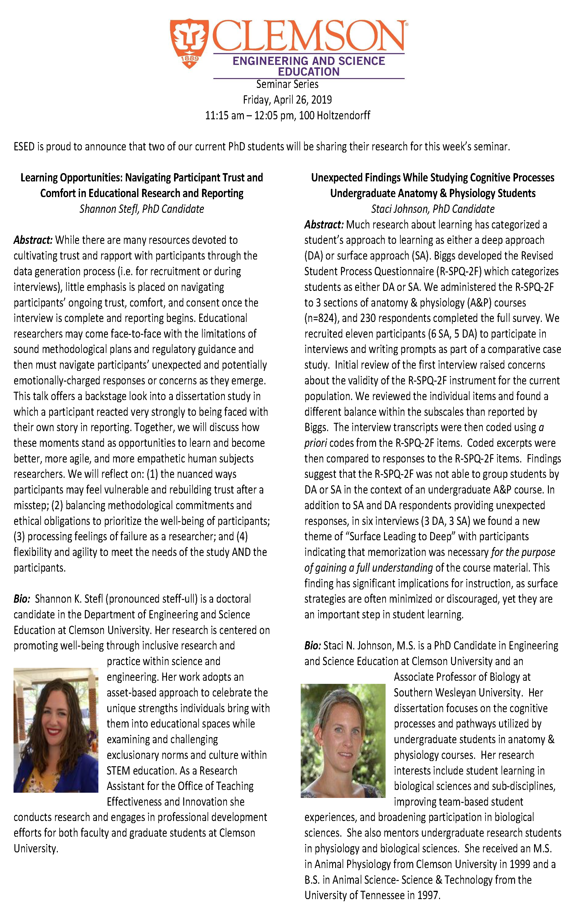 ESED PhD Candidates Shannon Stefl and Staci Johnson to Present a Seminar on April 29 Posted on April 19, 2019 by Teri Garrett
