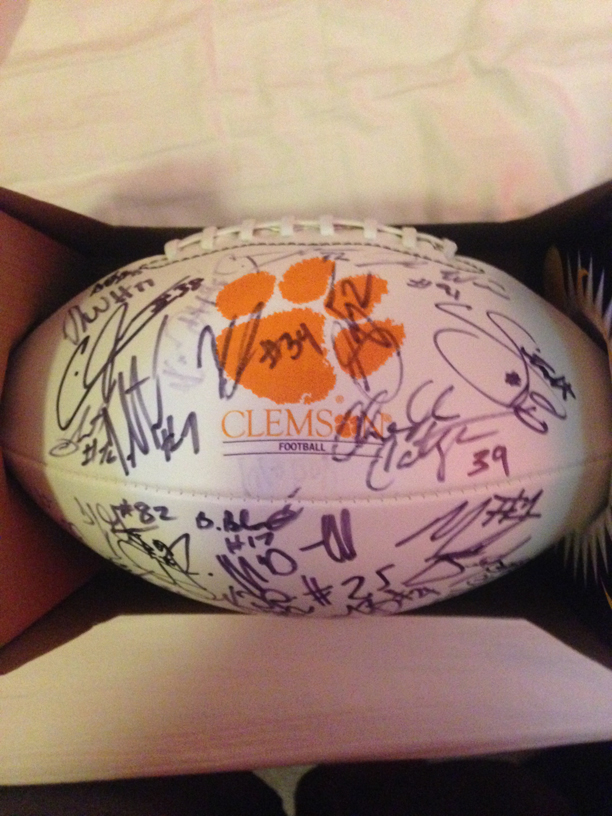Gifts: Two footballs signed by football team players (not every team member could sign) and two footballs signed by Dabo Swinney will be drawn from tickets given to contributors during the staffed hours.