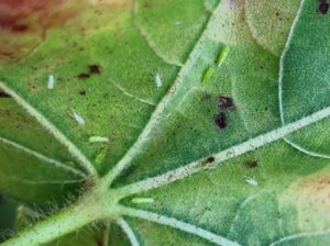 Figure 1. Adults and nymphs of two-spot cotton leafhopper feeding under cotton leaves.