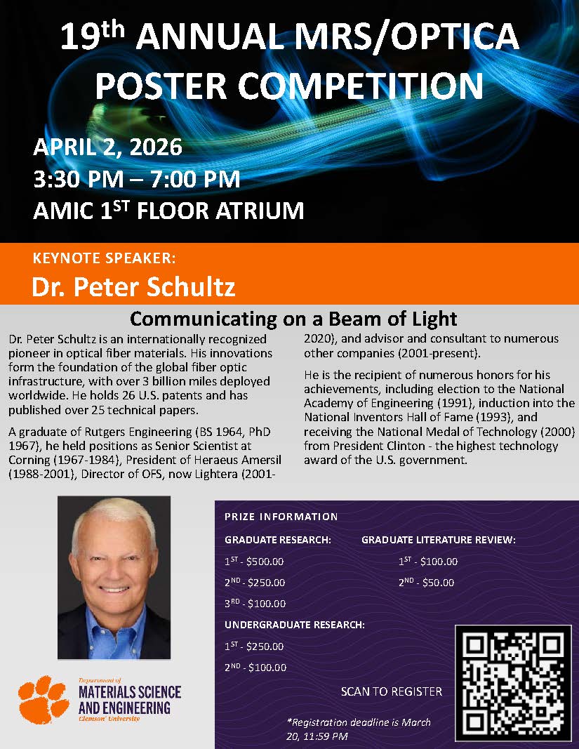 MRS/OSA will hold it’s 19th Annual Poster Competition on April 2nd in the AMIC Atrium. The Seminar featuring Dr. Peter Schultz begins at 3:30 PM in AMIC 1101. The registration deadline is March 20th.