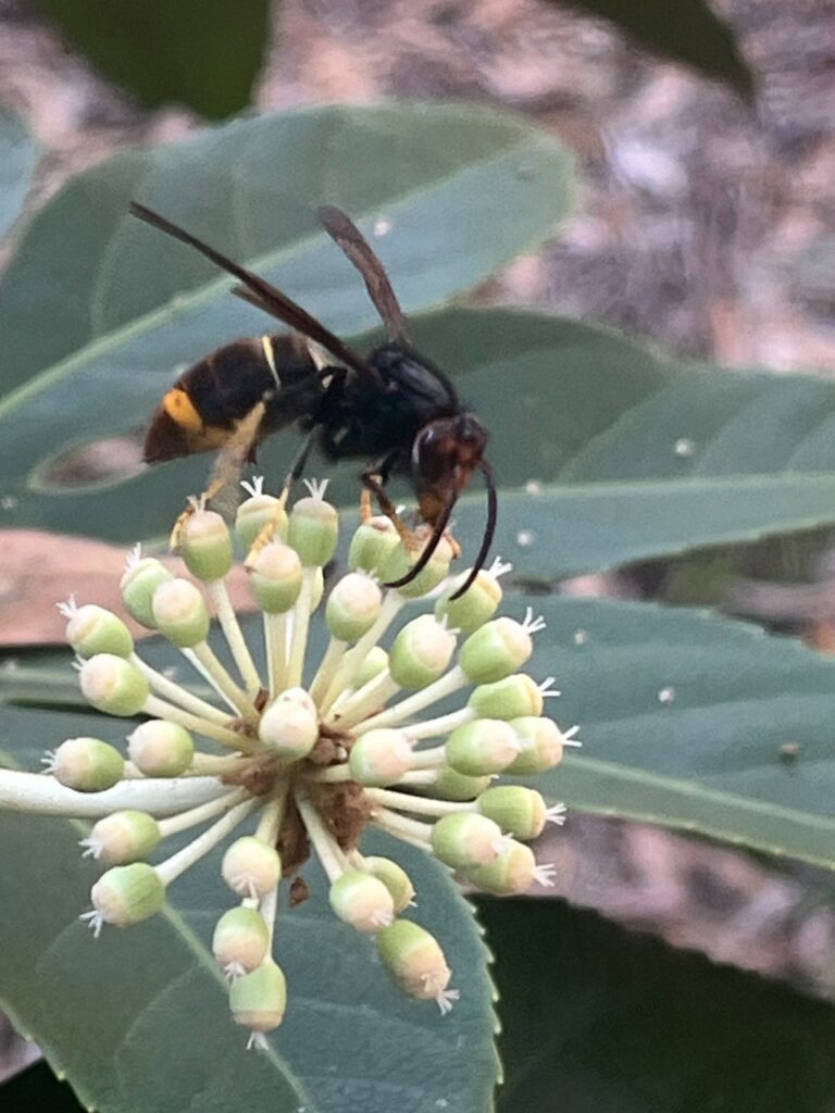 YLH Secondary nests have been constructed and are in the dispersal stage of the life cycle. Dispersal is a multistep process where new queens (gynes) and males are produced. The queens will seek a sheltered location to overwinter; some examples are loose soil, leaf litter, mulch, and tree bark crevices. Nests are at peak population, which means more worker hornets, more foraging behavior, more protein available, and therefore more brood. We are encouraging people that live in the Low Country or York County of South Carolina to inspect all outdoor structures, trees, and shrubs for any YLH activity and report any findings. Beekeepers are still encouraged to report any hawking behavior.