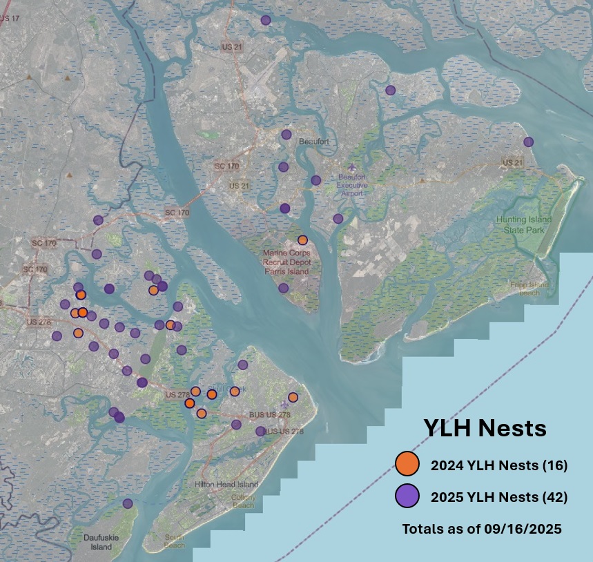 The above map reflects YLH nests located and removed in 2024-25. To view the live map, please follow this link to Clemson® DPI’s GIS map of known YLH nest locations in South Carolina.