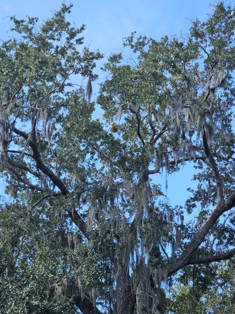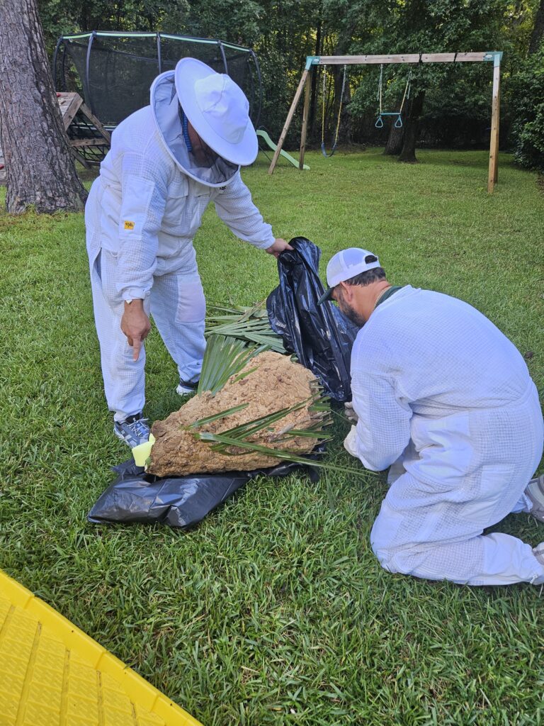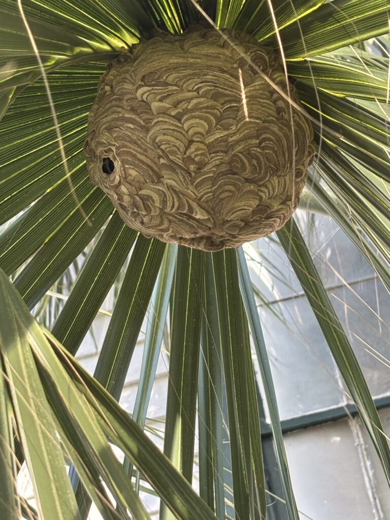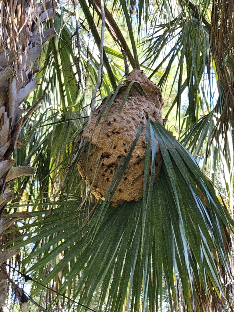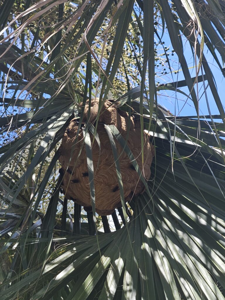 Photo description: Nests are located in several types of trees including Palms. This massive secondary nest located 15 feet in this palm was discovered in Beaufort County. Professional exterminators help ensure nests are removed safely and quickly making sure the queen doesn’t escape to reestablish a new nest site.