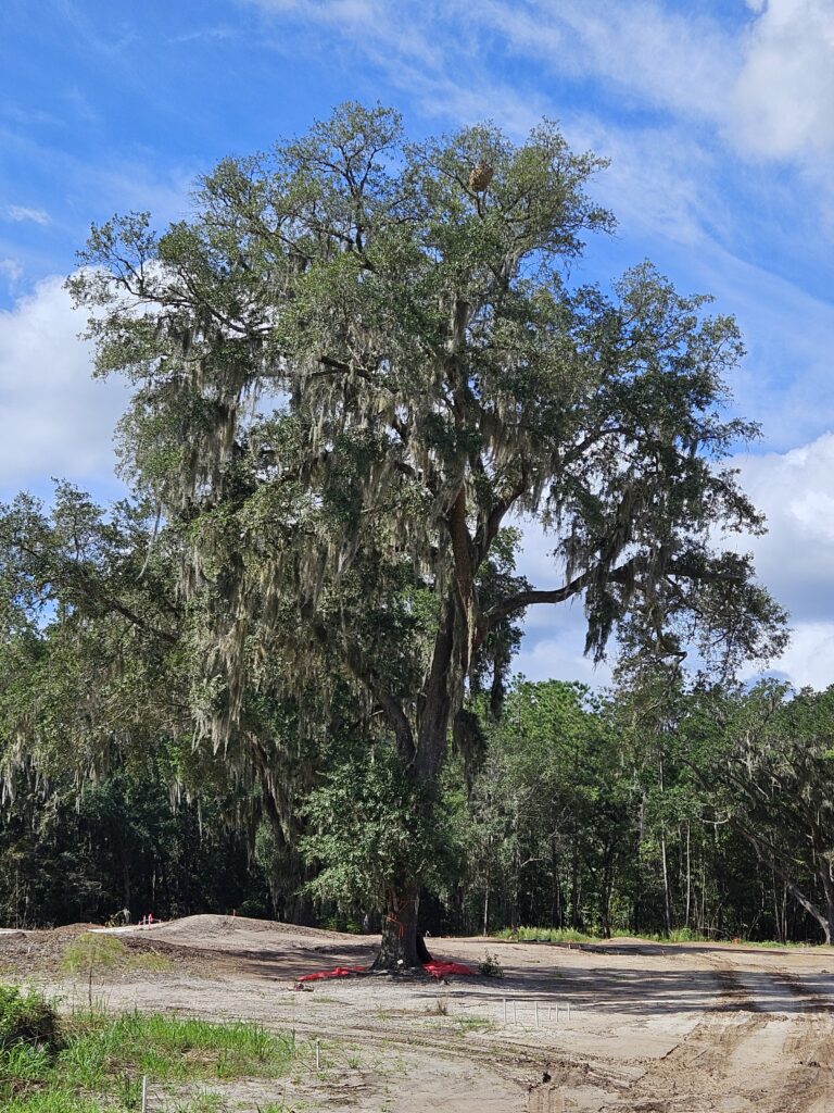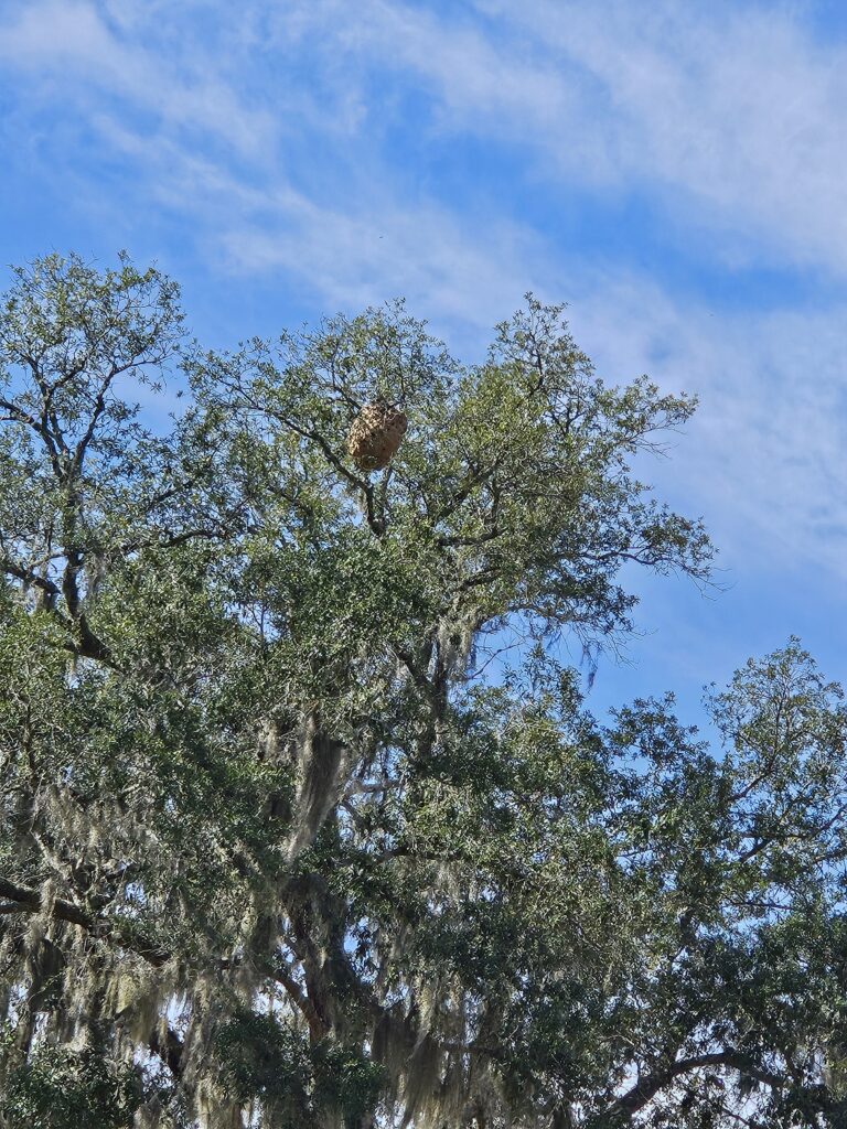 Photo description: DPI is actively searching multiple locations in Beaufort County and Jasper County for Yellow-legged hornet secondary nests. Nests are now in trees and will increase in nest size and YLH populations. We are asking people to report nests to the YLH Reporting Tool. We ask the public to be patient, we are receiving multiple reports every day. Every report helps. This nest was located in an Oak tree at approximately 55 feet.