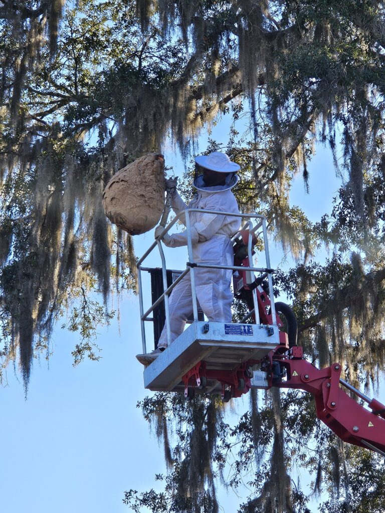 Photo description: The above pictures were taken in Beaufort County, SC. This represents an example of a YLH nest that is being located and removed. YLH will establish nests in multiple types of trees, on and inside structures.