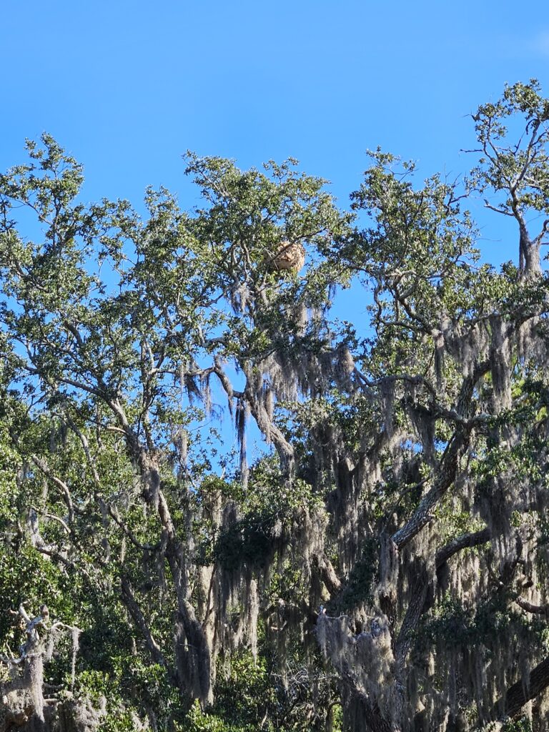Photo Description: Clemson Department of Plant Industry (DPI) is actively searching multiple locations in Beaufort County and Jasper County for Yellow-legged hornet secondary nests. Nests are becoming more visible with trees starting to defoliate. We continue to ask the public to report nests to the YLH Reporting Tool. We ask the public to be patient, we receive a high volume of reports every day. Every report helps. Reports will receive an automated response.