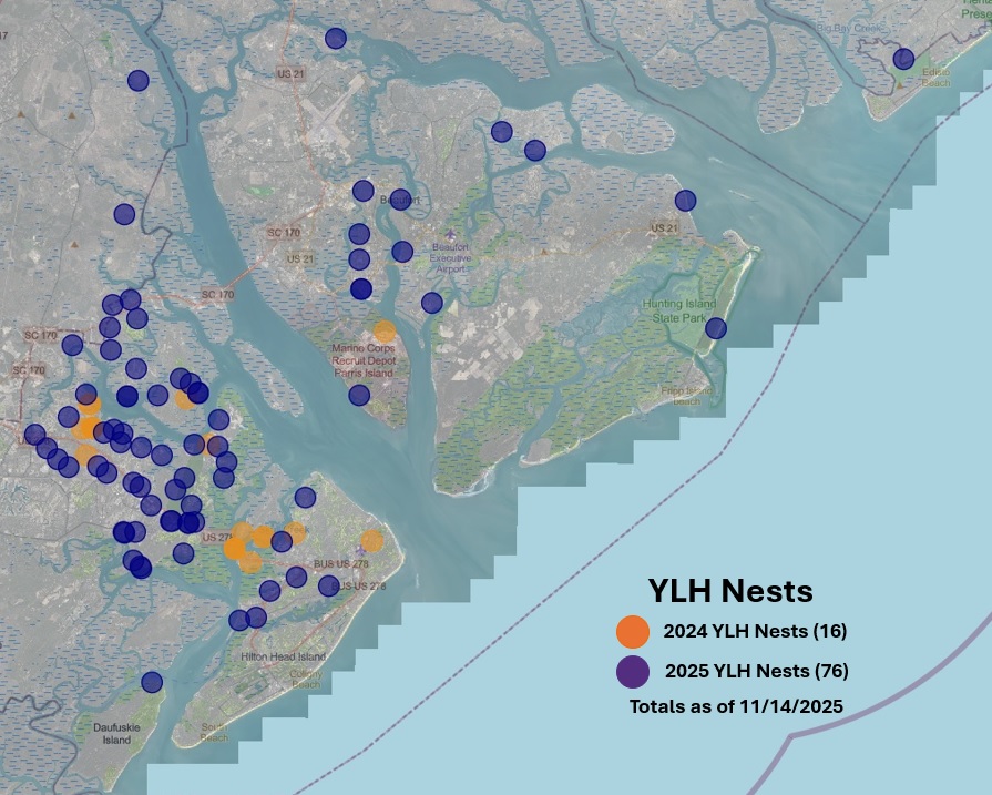 The above map reflects YLH nests located and removed in 2024-25. To view the live map, please follow this link to Clemson® DPI’s GIS map of known YLH nest locations in South Carolina.