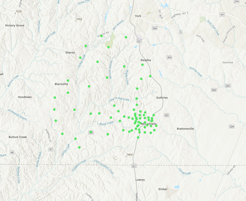 Image descriptions: The above maps are the current YLH trapping areas in the Low Country (left) and York County (right) of South Carolina.