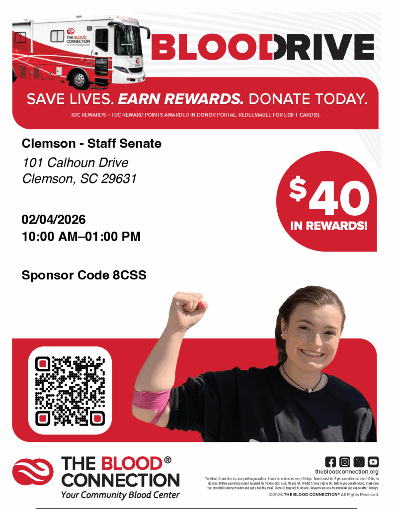 Clemson – Staff Senate is proud to host a community blood drive on Wednesday, February 4th, from 10:00 AM to 1:00 PM. This event is a vital part of our commitment to supporting and enhancing the health and well-being of our community.