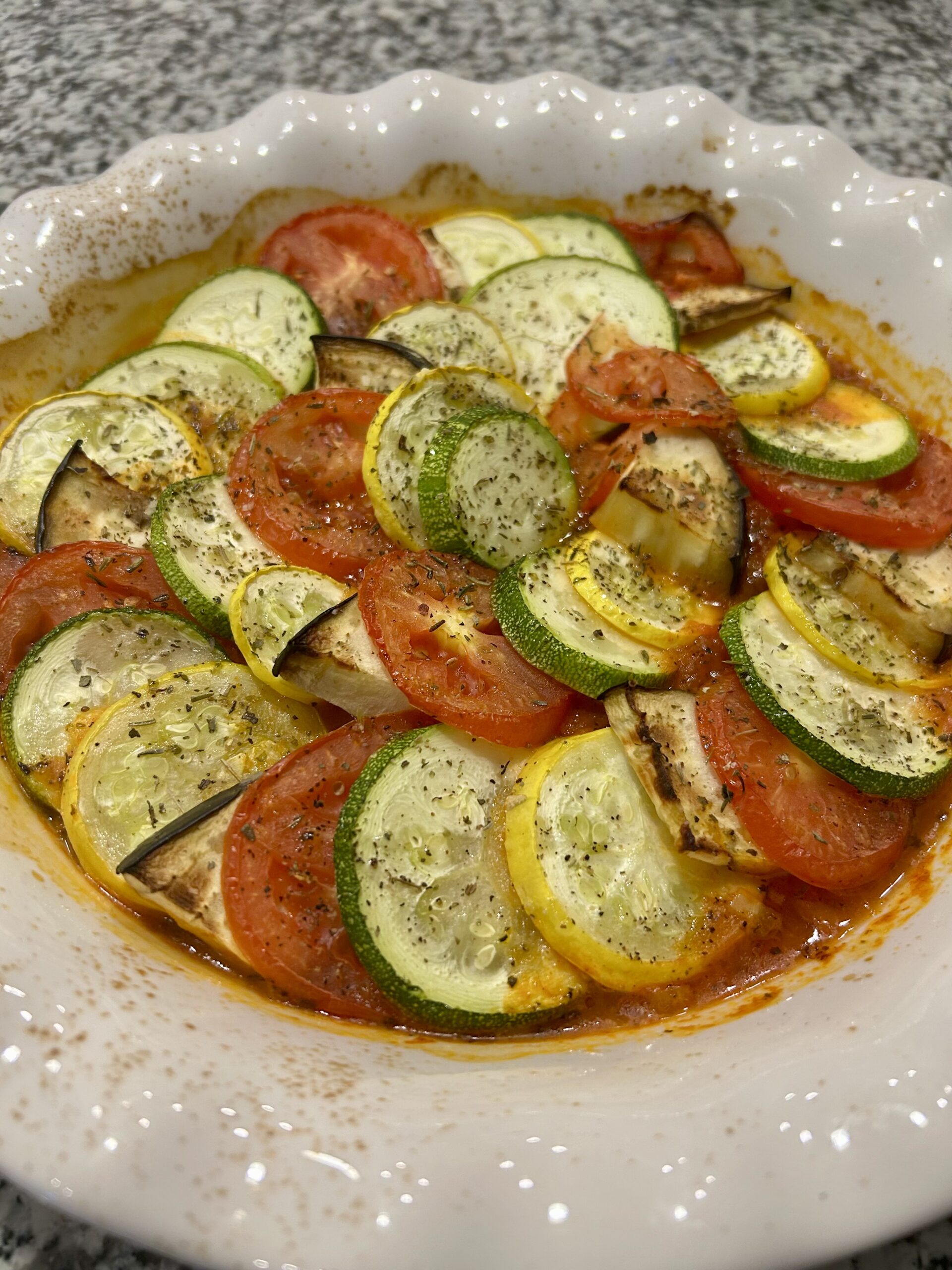 - Pour the sauce into a round baking pan or skillet and begin arranging your sliced zucchini, squash, eggplant, and tomatoes in an alternating pattern on top of the sauce. Drizzle over the remaining olive oil and sprinkle with salt, pepper, and the remaining Italian seasoning. Cover the pan with tin foil and bake for 15-30 minutes, or until the vegetables are tender and begin to brown. Serve immediatlly.