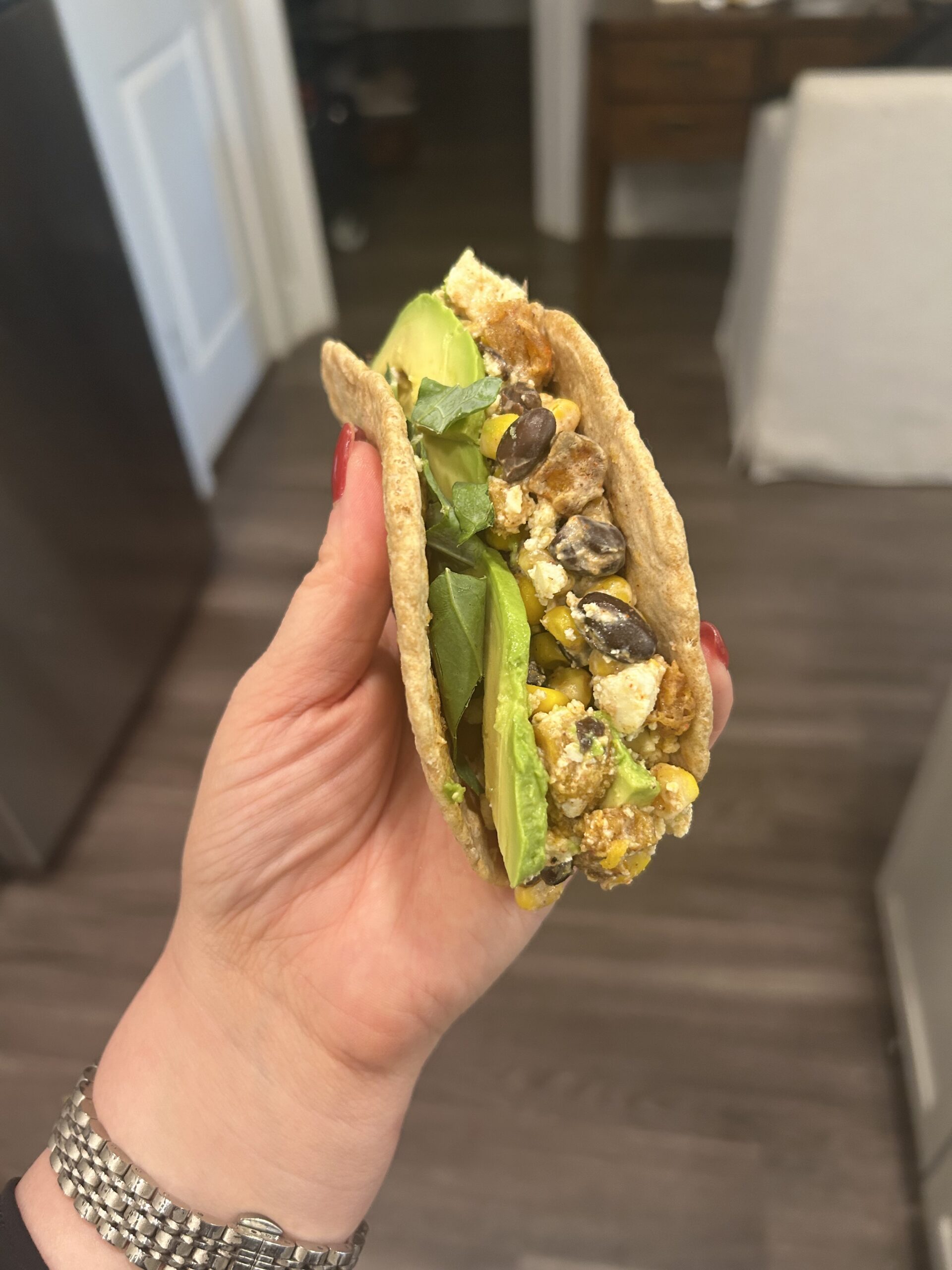 - Once the squash is done roasting, layer some of it onto a whole-wheat tortilla along with the corn and bean mixture. Top with a few avocado slices and hot sauce to taste.