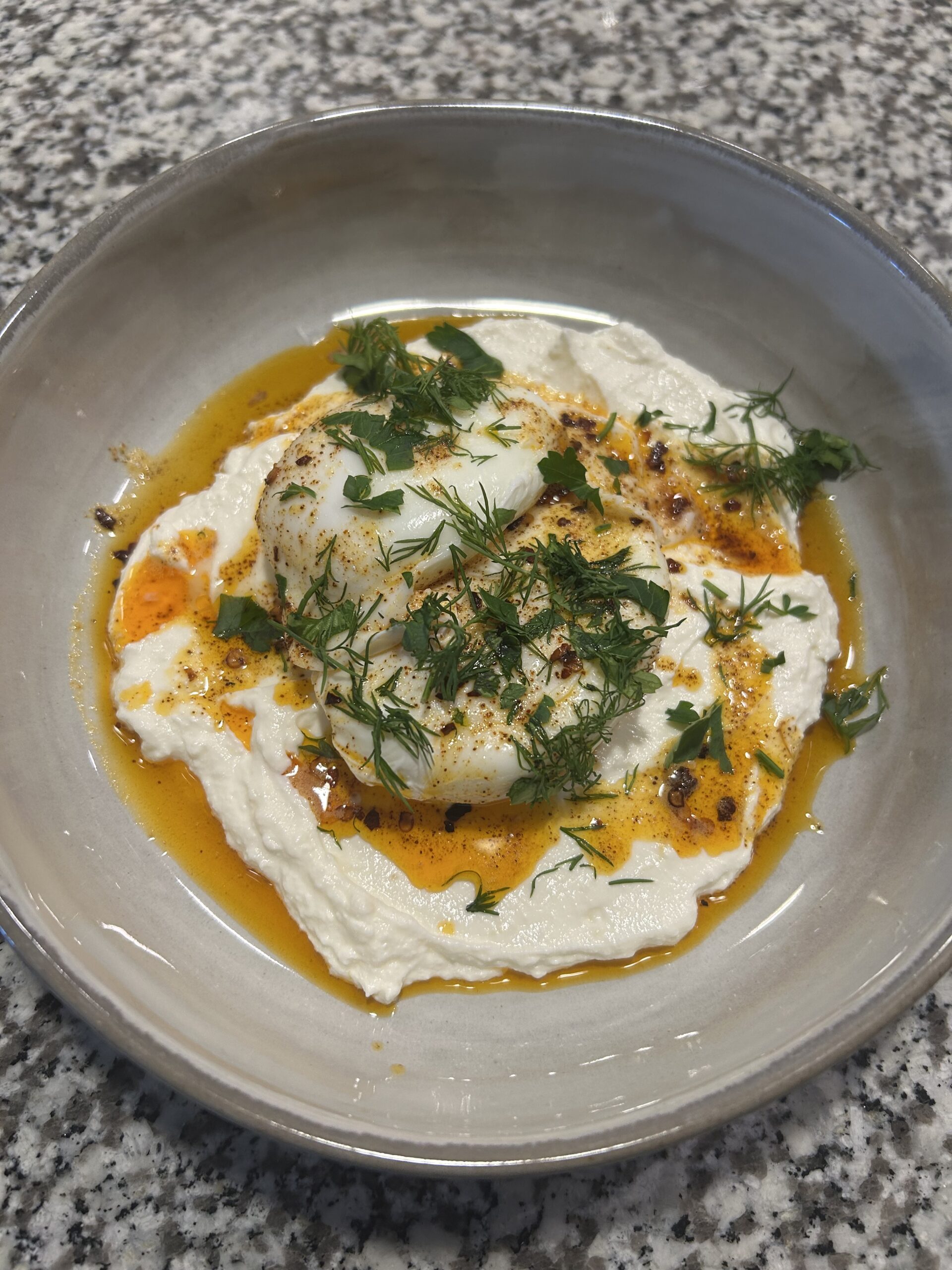 - In a bowl of your choosing, add the garlicky yogurt mixture. Top with two poached eggs, and drizzle the hot pepper butter and oil mixture over the top. Garnish with herbs like parsley, dill, or mint! Serve with a piece of crusty bread for a delicious start to your day.